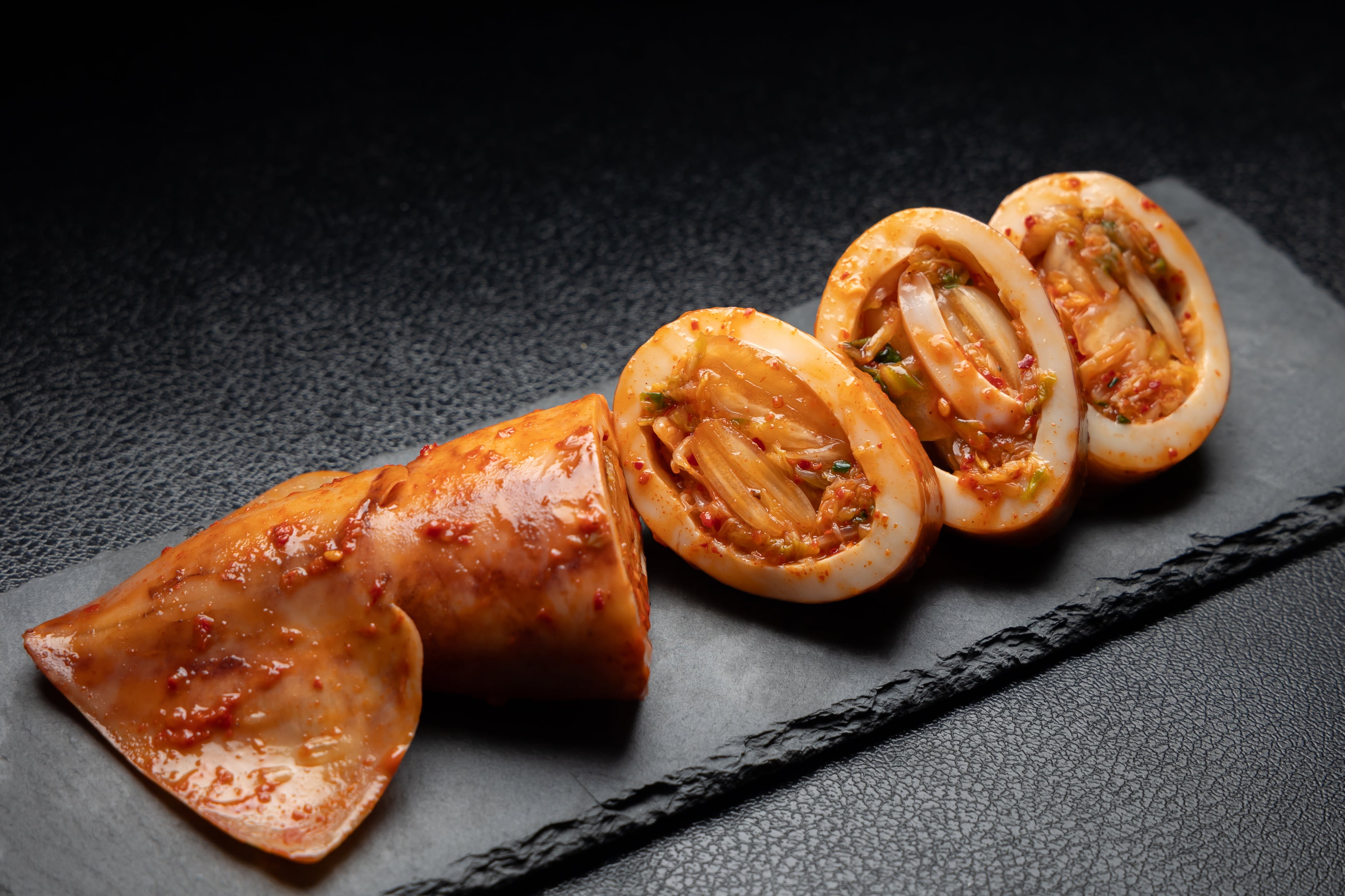 新鮮なイカをボイルして、お腹の中に当店自慢の白菜キムチを詰め込んだ逸品です。